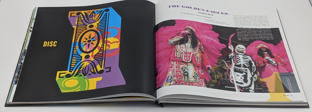12"x12" large format 136-page book beautifully designed by Visual Dialogue featuring essays and annotations by Keith Spera, Karen Celestan, Robert Cataliotti, Jeff Place, Rachel Lyons, and Jon Pareles, plus photos spanning the festival's history. 5 discs hold 50 tracks, over 300 minutes of music, history, and magic.
